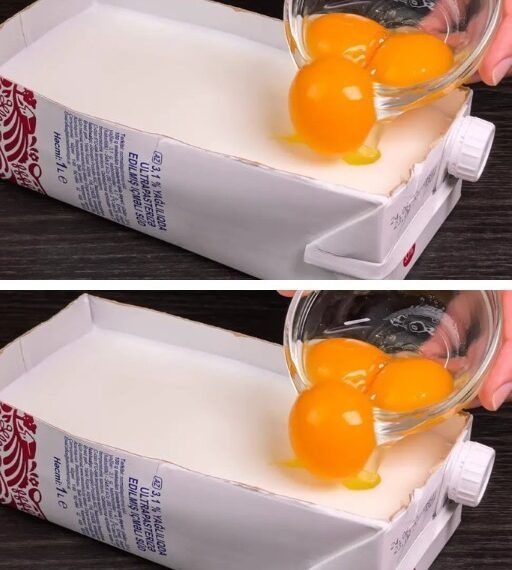L’image montre des jaunes d’œufs versés dans une brique de lait propre – un geste surprenant, mais astucieux, utilisé pour réaliser une crème dessert onctueuse.