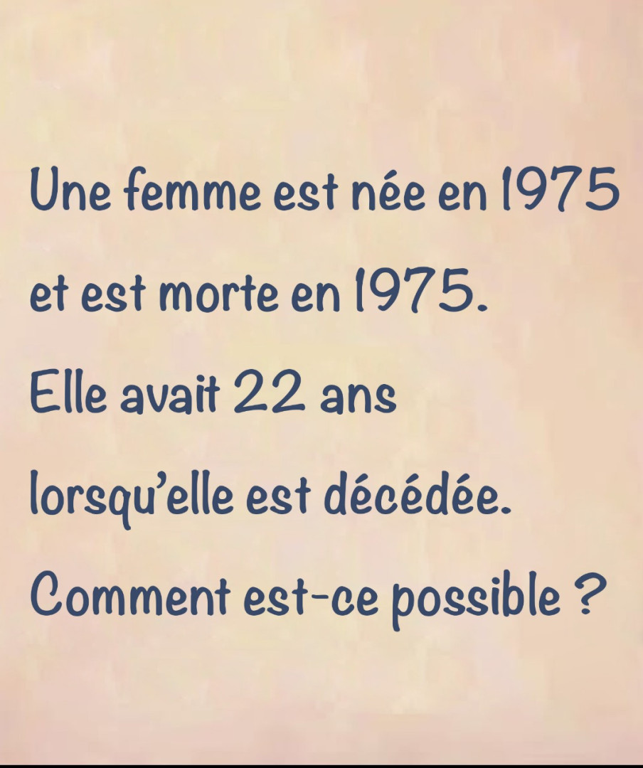Quand une simple date bouleverse nos certitudes : l'énigme de la femme née et décédée en 1975 à l'âge de 22 ans intrigue et déroute. Qui est-elle ? Où se cache le piège ? Découvrez comment une simple phrase peut remettre en question notre façon de penser et stimuler notre esprit critique.